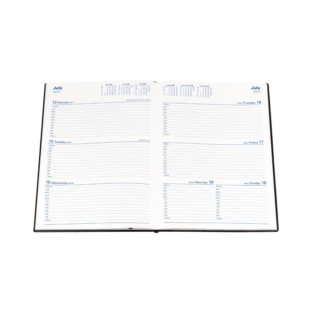 • Bound in a highly durable, welded PVC padded cover. Printed on white paper, week numbers and Julian days.