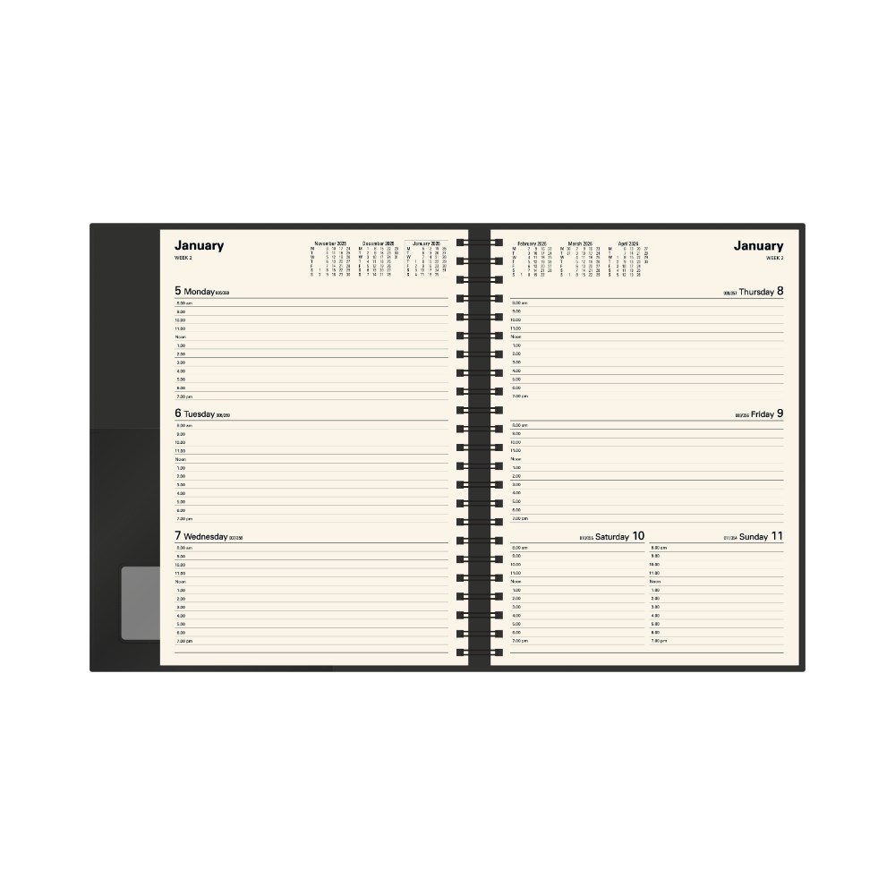 • Pen loop, lay flat opening, ribbon marker and week to view layout.
