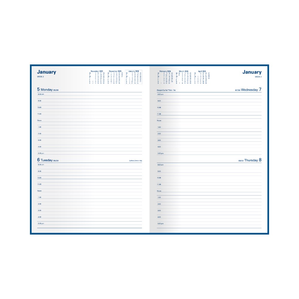 • Lay flat opening, ribbon marker, 2 days to a page layout.