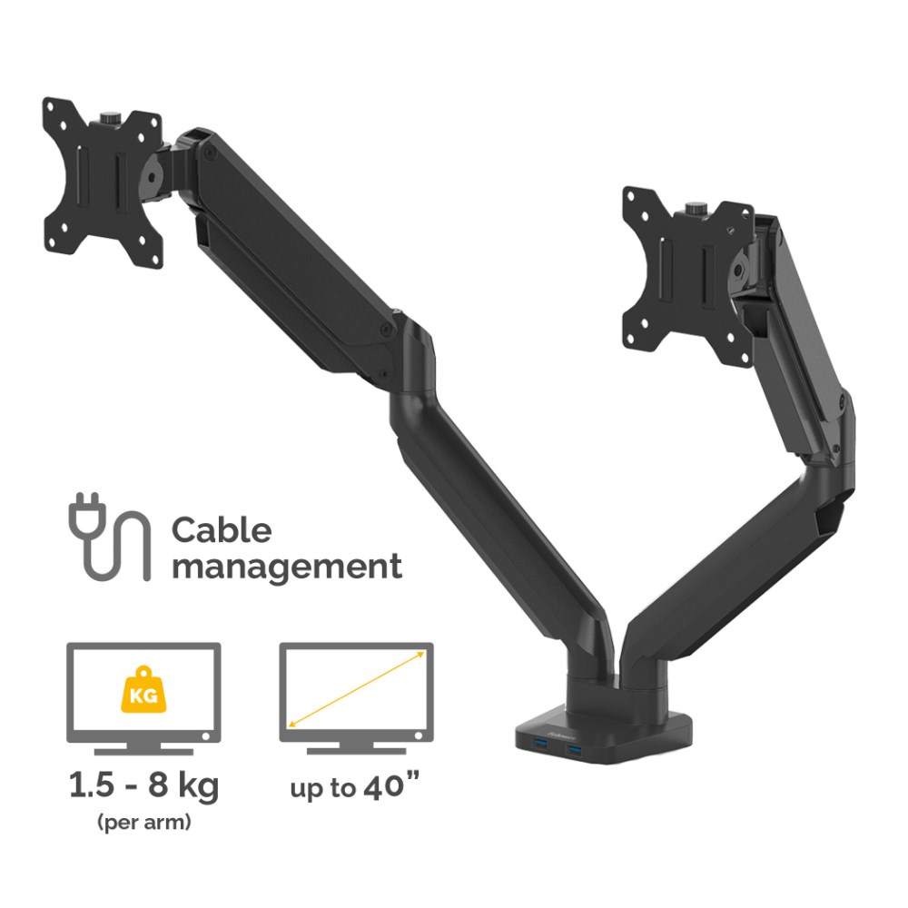 • Easily mounted via clamp or grommet, each arm holds a monitor up to 8kg (up to 40 inch monitors) and meets VESA mounting standards.