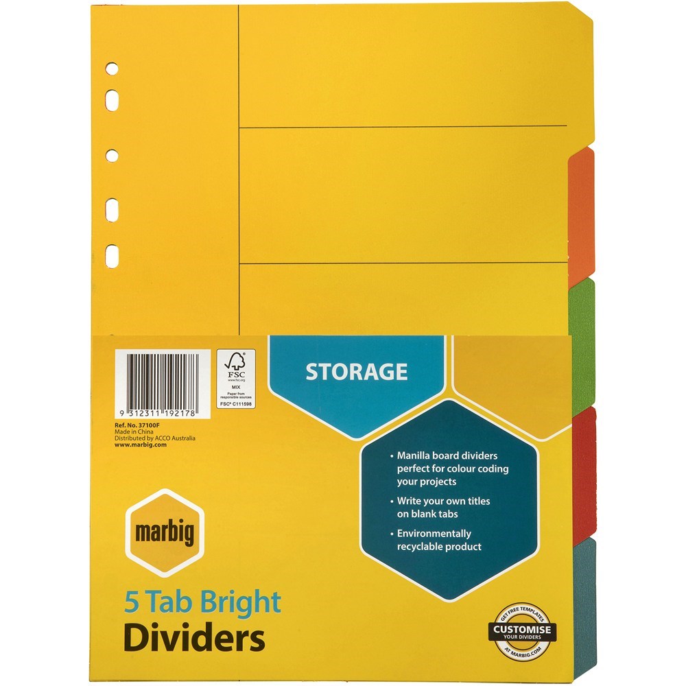 MARBIG MANILLA DIVIDERS 5 TAB A4 MULTI COLOURED BRIGHT SET