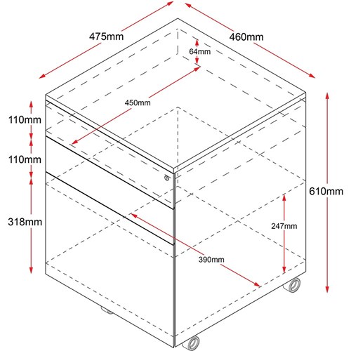 • Drawer Dimensions: Top: 390W x 475D x 65mmH. File: 390W x 475D x 250mmH.