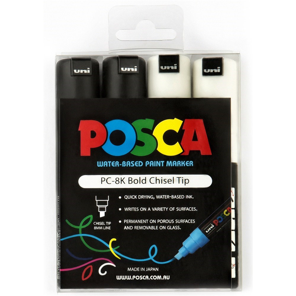 Uni Posca PC-8K Paint Marker Chisel Broad 8mm Black And White Pack of 4
